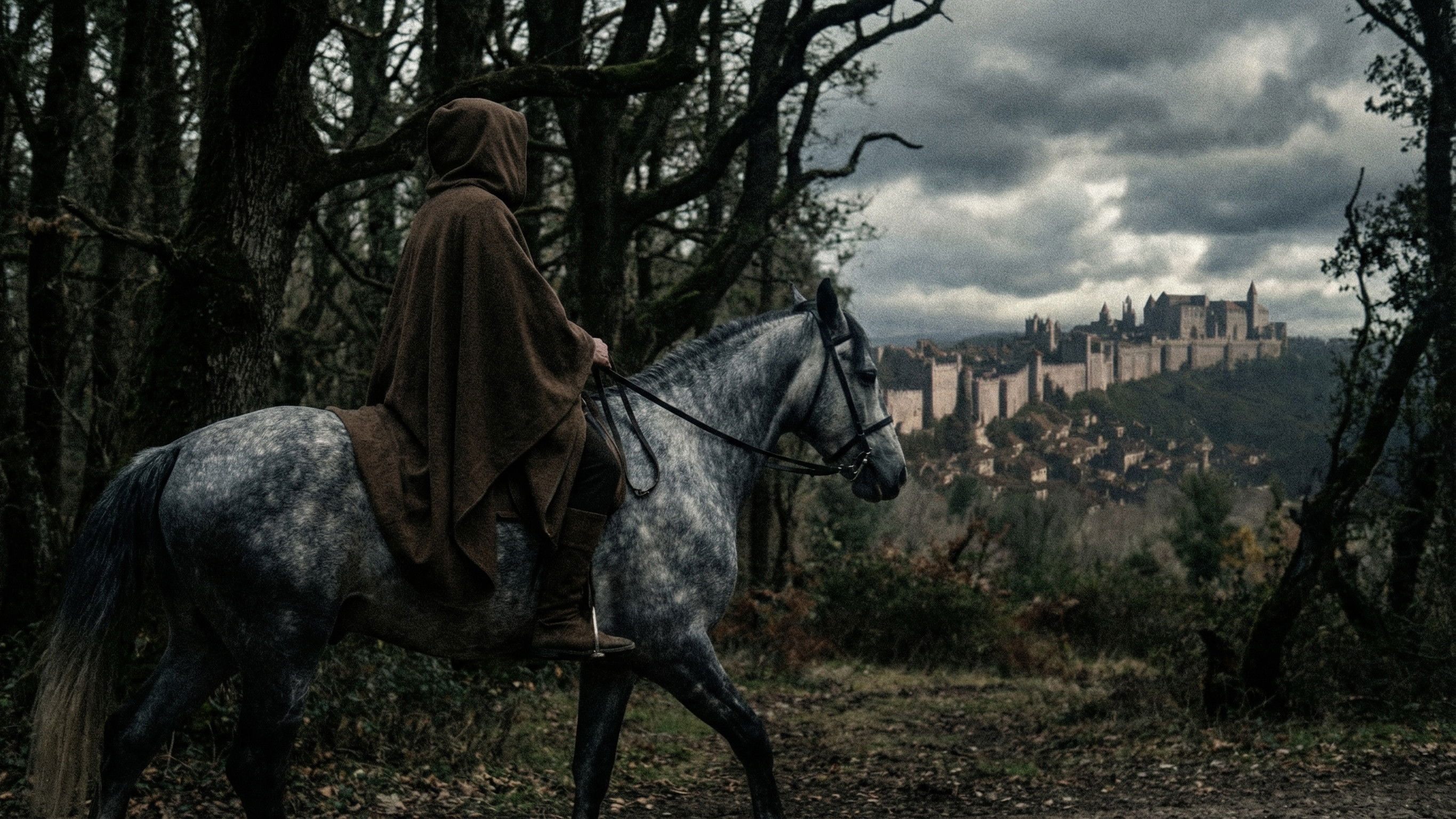 A lone man approaches the capital, its walls standing like guardians of forgotten truths. The streets are filled with villagers, moving through the alleys and squares, yet every glance and gesture seems weighted with fear and suspicion. Shadows cling to the corners where he once walked unnoticed, memories of past betrayals pressing against him like the walls themselves. Light flickers over stone and shadow, revealing traces of secrets no one dares to speak, reminders of debts unpaid and eyes that once turned from him. He moves forward, measured, unseen yet undeniable, a presence honed by suffering and sharpened by vengeance, a reckoning slowly coiling around the heart of the city. The calm is deceptive, and the weight of what is coming lingers in every stone, every shadow, every glance, as if the city itself holds its breath in anticipation.